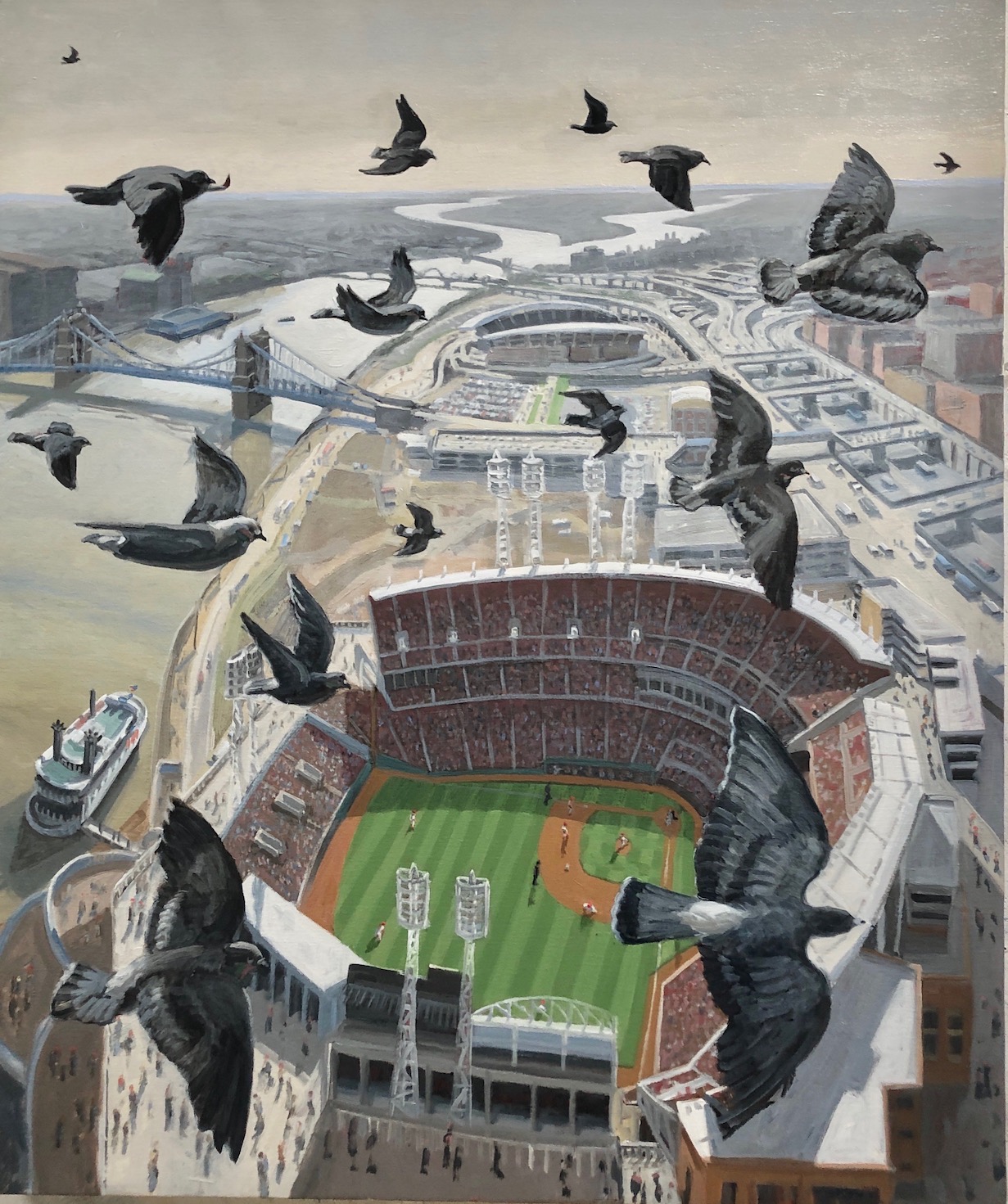 The early baseball paintings were about the figures, light, space and imagined action of a ballgame. The recent ones are mostly about the stadiums, the fans and landscape of the cities they are in. All are a throwback to a certain twelve year old boy’s imagination. He is at his grandparents house in suburban St Louis surrounded by the love of family, his baseball cards, and his fantasies of baseball. The fantasies are as real as his actual experience and the hope of that time. All things were possible and a scrawny twelve year old boy could pop out of the cool of the Cardinals dugout with a bat in his hands and win the game while the crowd cheered.