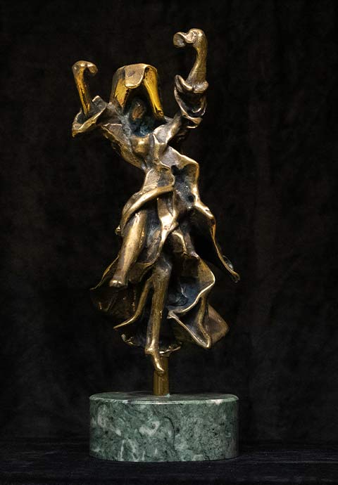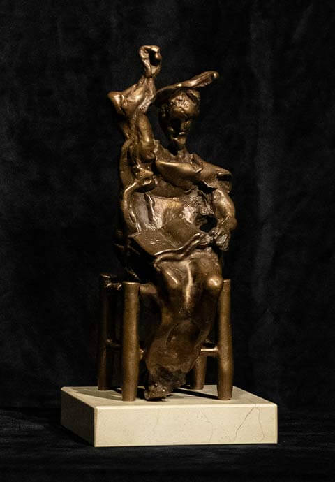 This bronze was Dalí’s first sculpture of the ‘knight with the sorrowful face’ and shows Don Quixote seated on a simple chair in a country inn, reading about the exploits of his heroes which fuel his dreams and adventures. Dalí portrayed the characters from Cervantes’ masterpiece many times in drawings, watercolors, and engravings. After fleeing to America during WWII he gained several opportunities to use his art in American mainstream pop culture working with Alfred Hitchcock and Walt Disney.