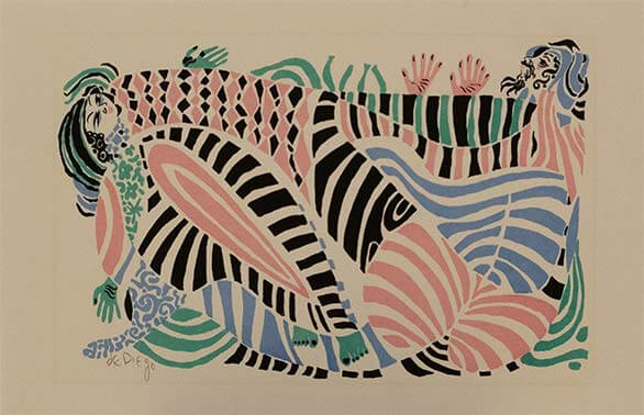 At age 15, De Diego left his home after discovering his father had destroyed ‘every drawing in the house’. He soon sold his first painting in a casino. After immigrating to America, he produced scenery for opera productions and began worked as a fashion illustrator in Chicago. He served for two years in the Spanish calvary. In 1924 he threw entire life savings from the observation deck of the Woolworth building, the tallest at the time, in New York City claiming he wanted to start from scratch. He painted murals for the Works Progress Administration (WPA). In 1946 he participated in an exhibition titled Modern Handmade Jewelry at the Museum of Modern Art in New York City. He was known by friends to dress flamboyantly and smoked cigarettes constantly.