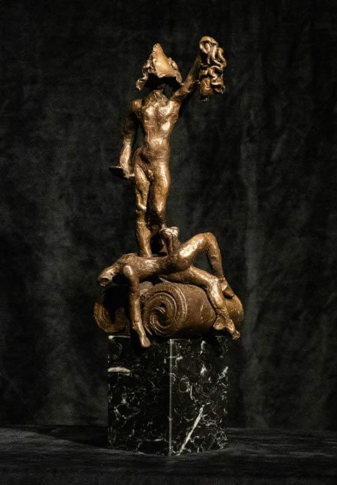 Dalí’s helmeted Victory showing Perseus holding high the head of Medusa, the Gorgon whom he has just slain, is directly inspired by his admiration for the masterpiece created by Benvenuto Cellini, which he saw during his many trips to Florence. During the 1960s Dalí pivoted his focus on religious painting and was later awarded the distinguished Grand Cross of the Order of Isabella The Catholic.