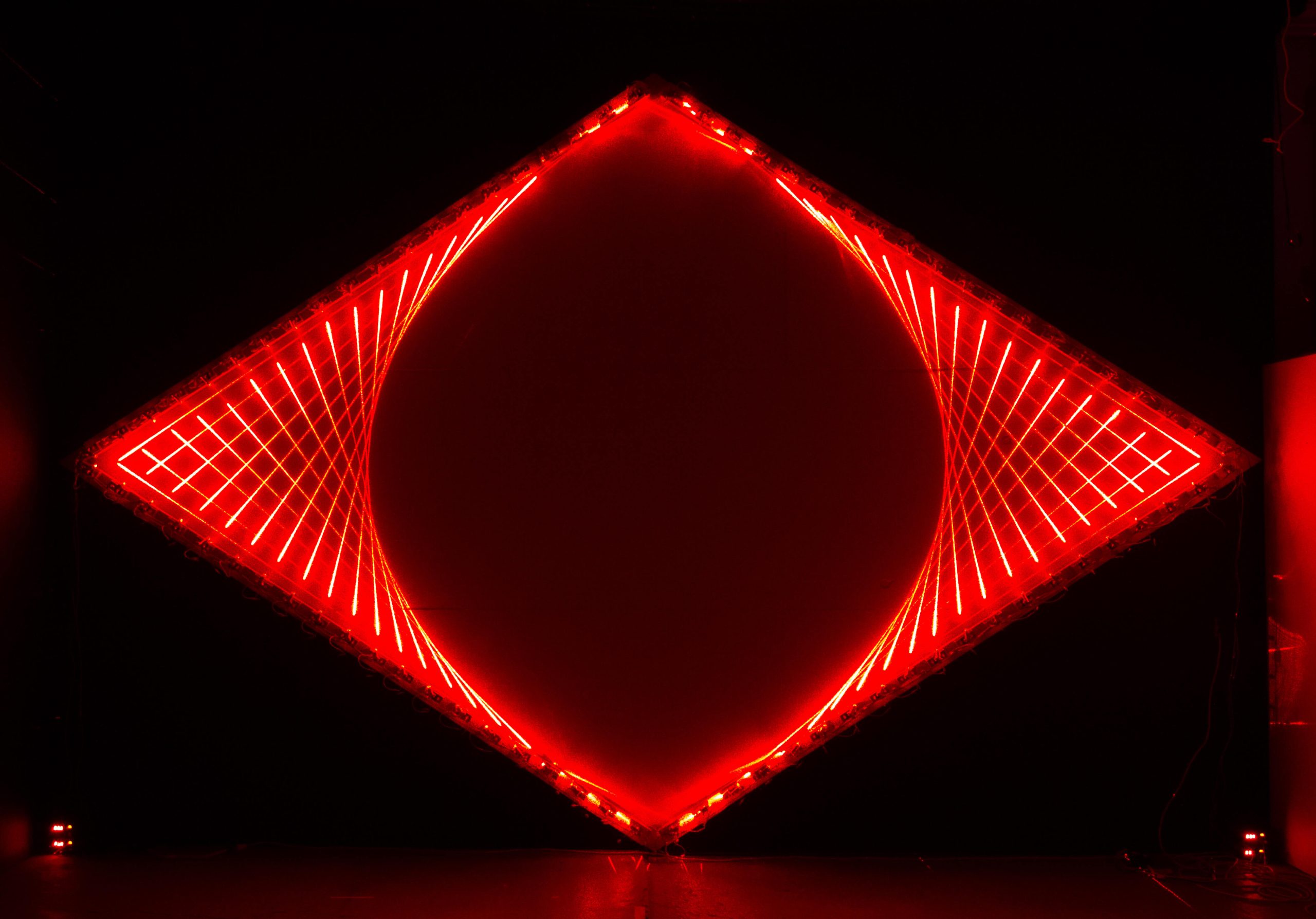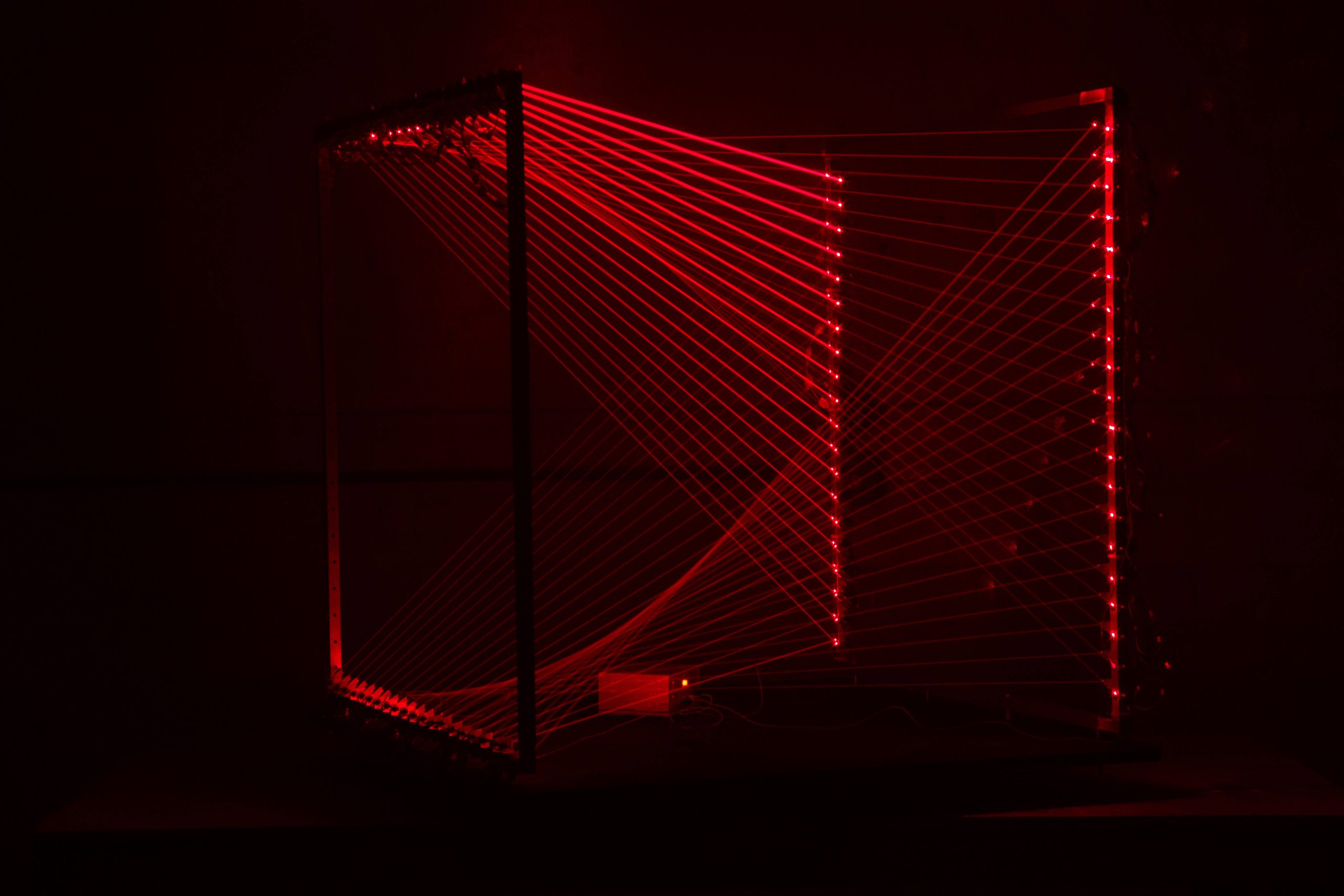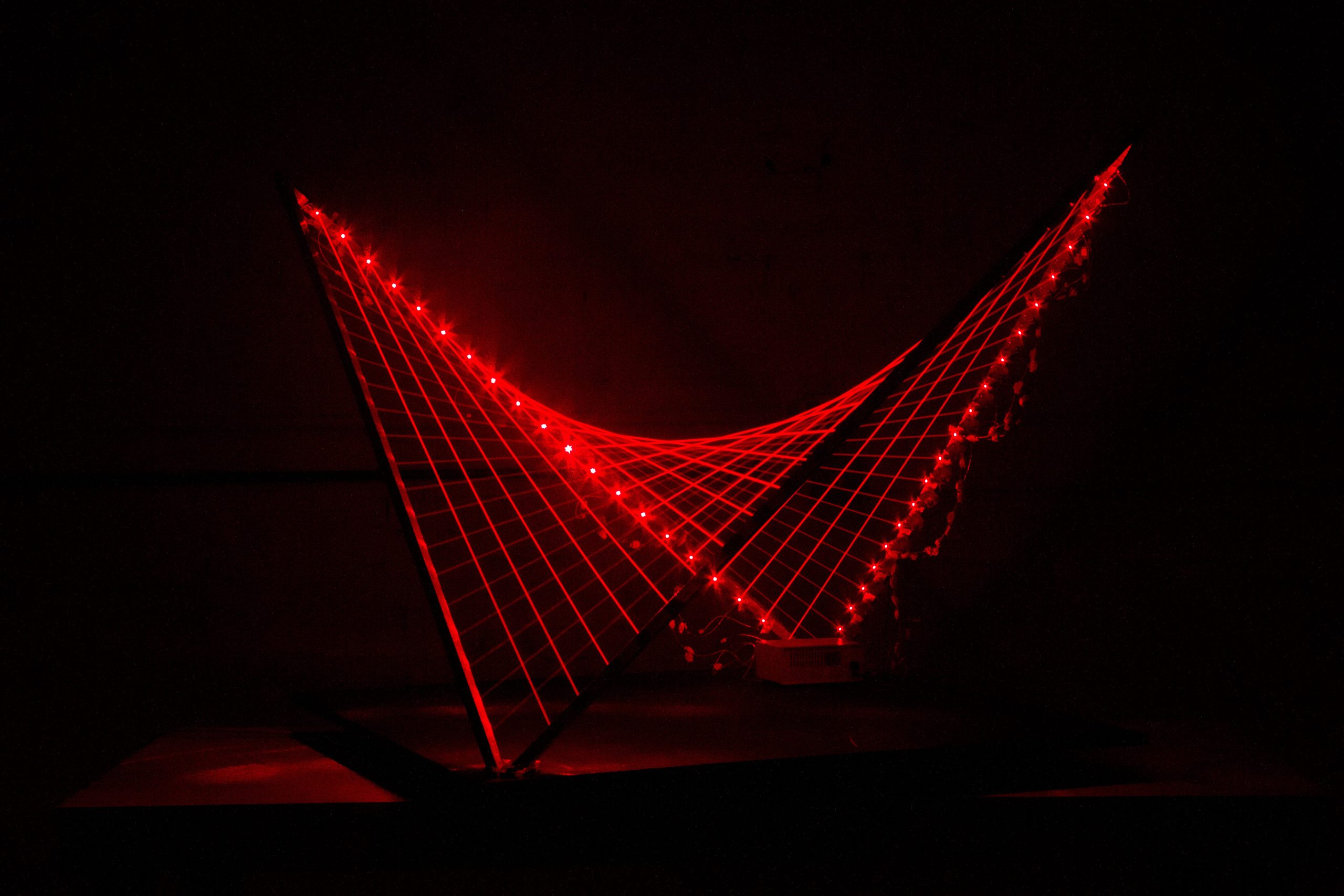 Tetrahedron Maquettes (2024), Approximately 48″x48″x78″, lasers, electronics and welded aluminum.
