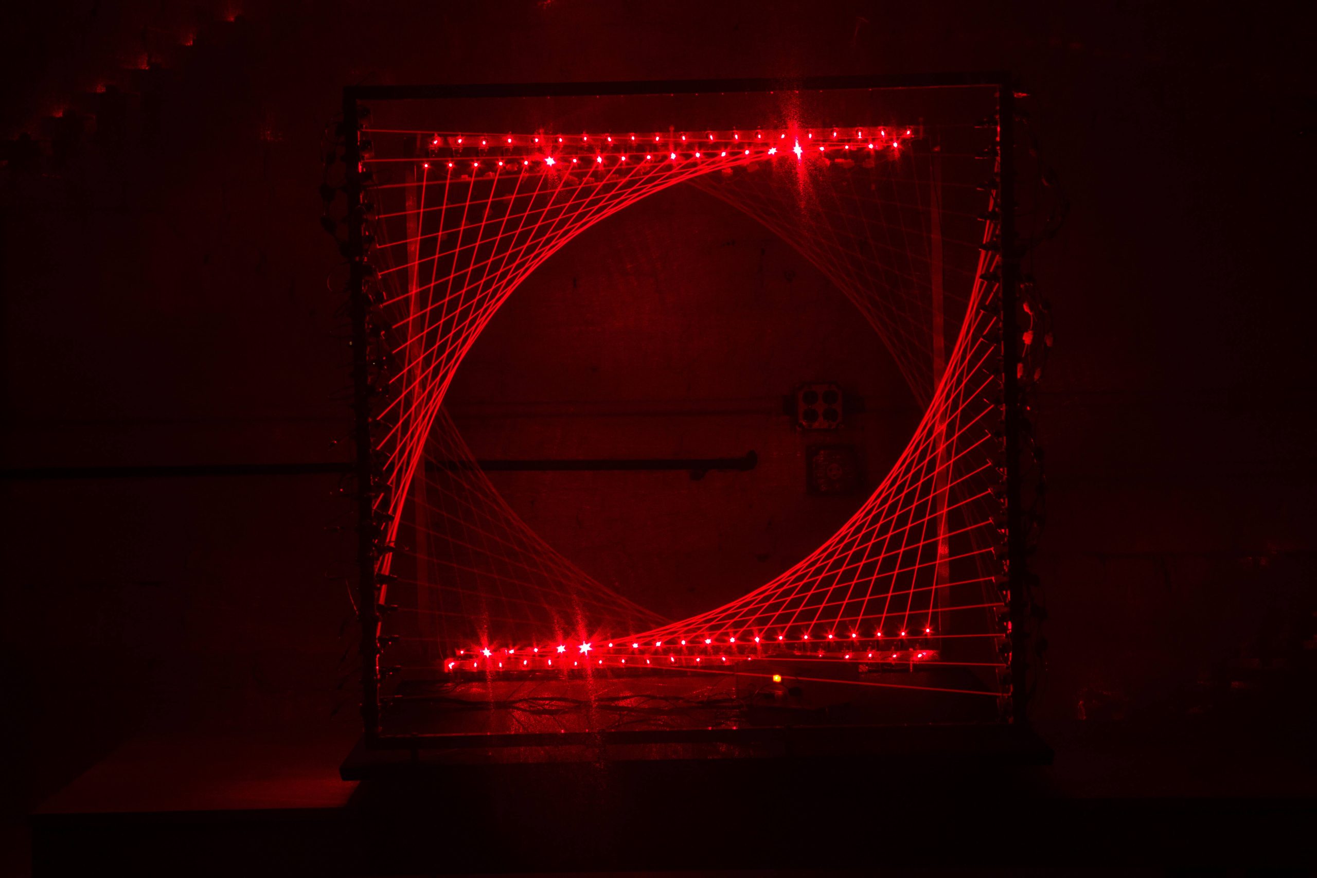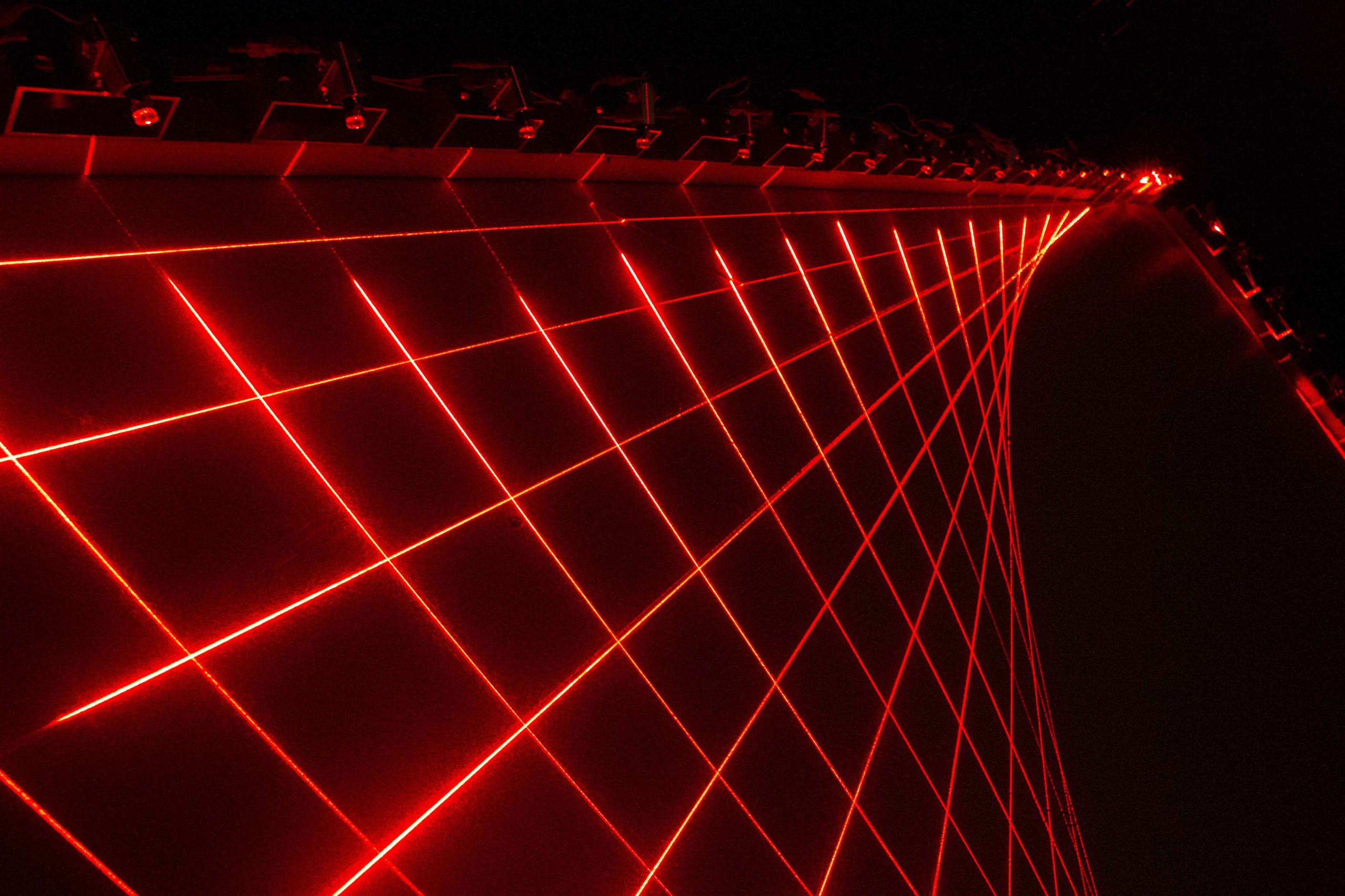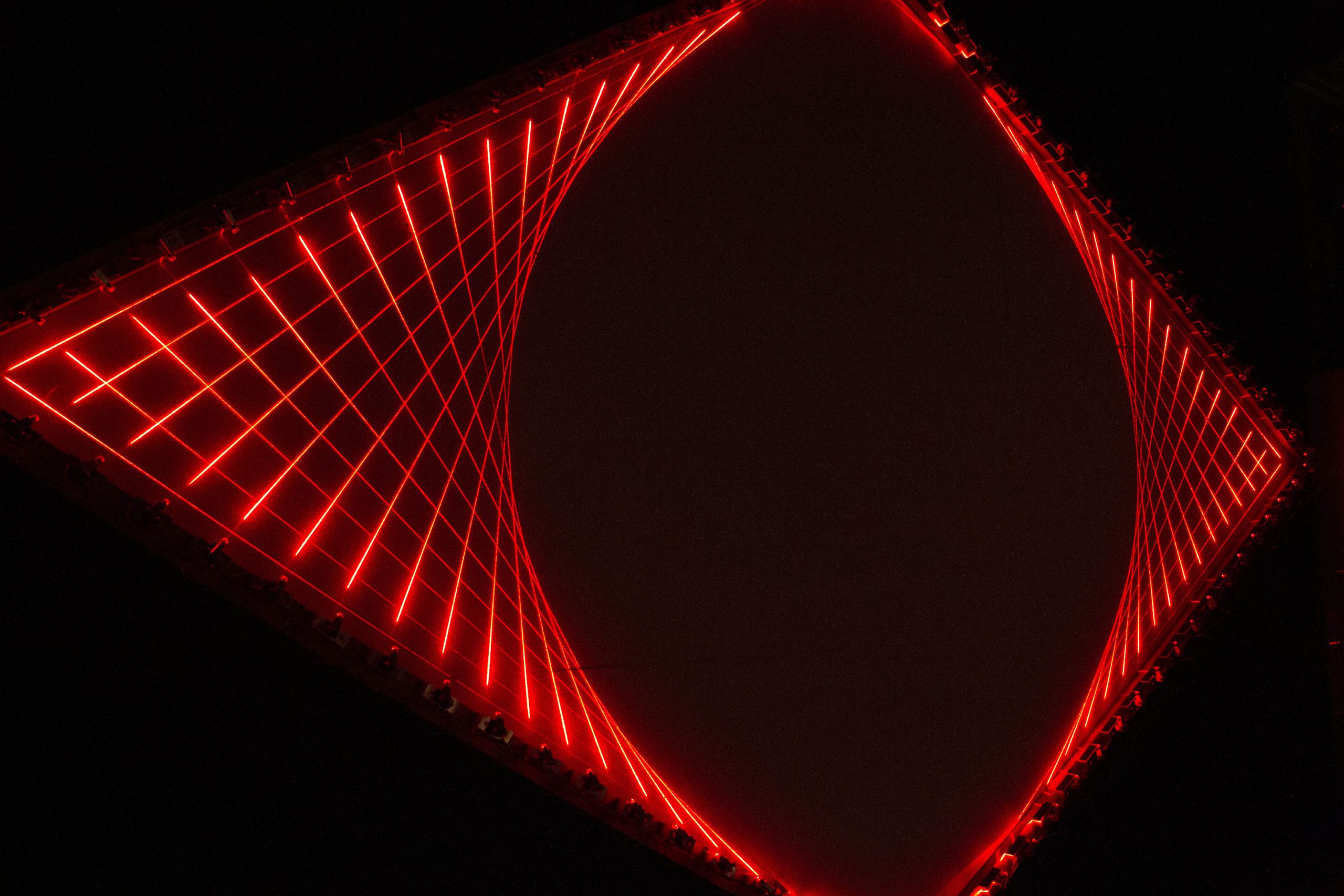 Tetrahedron Maquettes (2024), Approximately 48″x48″x78″, lasers, electronics and welded aluminum.