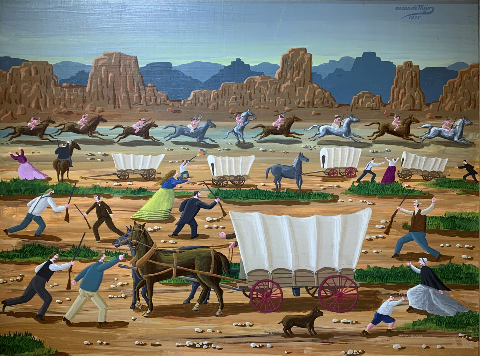 “The artist Oscar De Mejo was an Italian immigrant who used his artistic talent to celebrate America and Americans. Twenty-six canvases by De Mejo were a gift to the Butler from the late magazine publisher Bob Guccione and his wife. Mr. Guccione was struck by the wonderment of these fascinating works of art which might best be characterized as somewhat primitive in style. They tell a wonderful story of America’s challenges and triumphs. This exhibition is about a uniquely talented artist in love with his country and its history.”